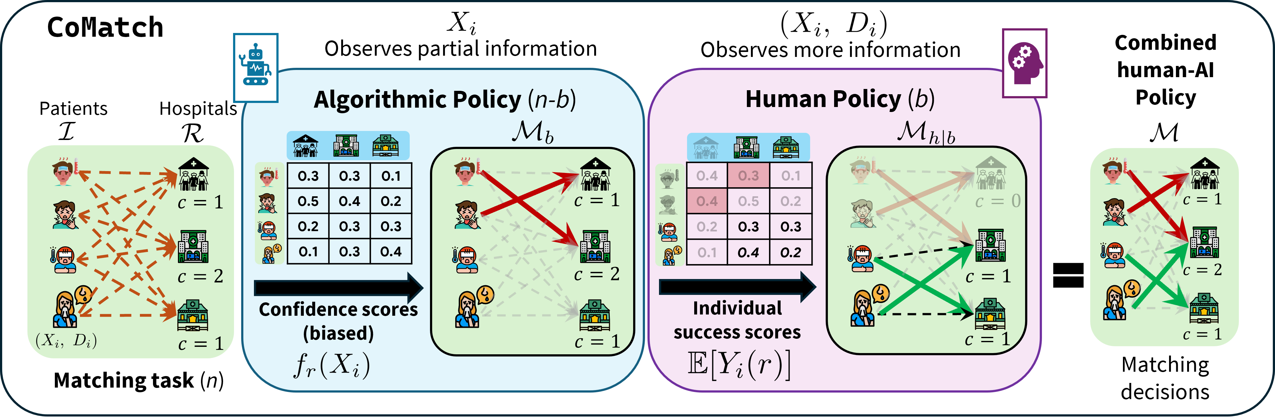 What it does. Proposes CoMatch, a framework where the algorithm handles confident assignments and defers uncertain cases to humans. A bandit-based optimization (UCB1) dynamically tunes this division of labor, achieving higher joint utility and adapting to each user’s performance — thereby operationalizing human oversight and complementarity by design.