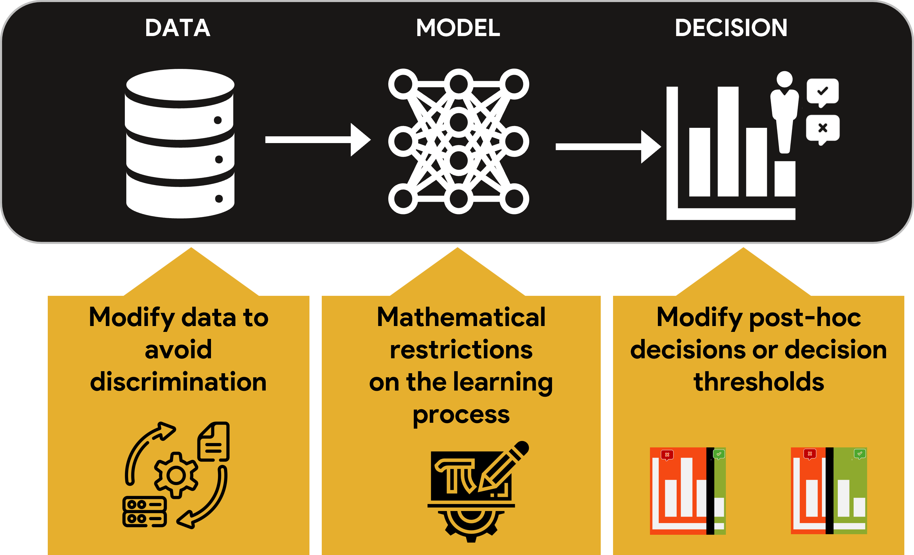 In practice, bias can be reduced or compensated for at different stages of the model pipeline:
