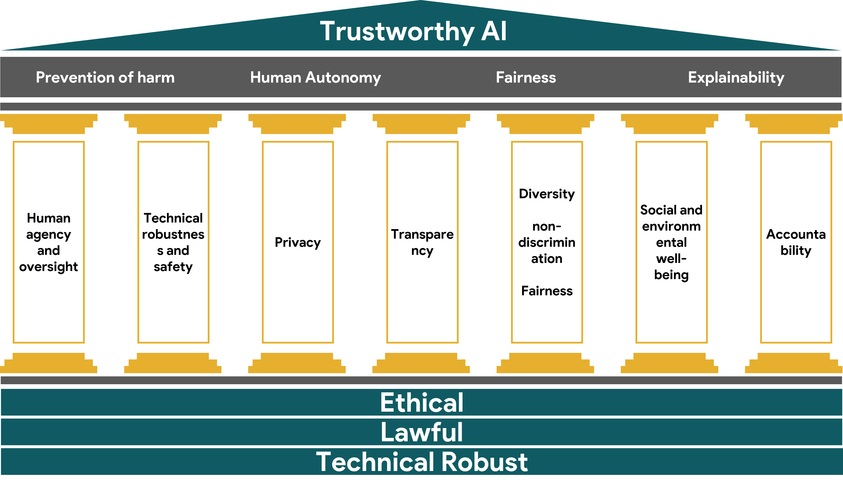TAI rests on three components — lawful, ethical, robust — grounded in four ethical principles (autonomy, prevention of harm, fairness, explicability) and implemented via seven requirements: human oversight; technical robustness and safety; privacy and data governance; transparency; diversity and non-discrimination; societal and environmental well-being; accountability.