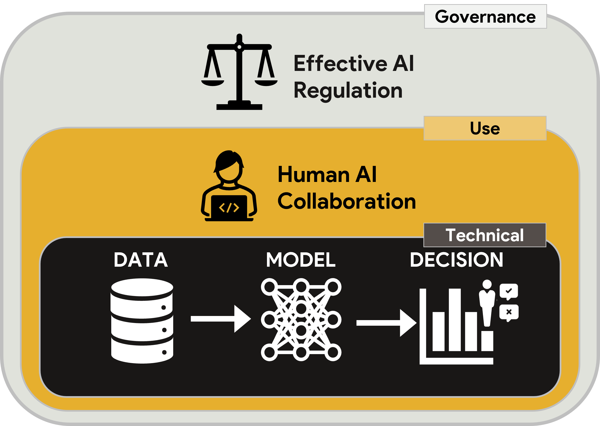 AI-related harms do not arise from algorithms alone but from the interaction between technical design, human behavior, and institutional context. Ensuring Trustworthy AI is therefore a sociotechnical problem: it requires simultaneous progress in the design of algorithms and data, the way humans use and oversee them, and the governance structures that regulate their deployment. The following sections examine each of these three spheres—technical, use, and governance—to show how their integration enables the effective implementation of Trustworthy AI.